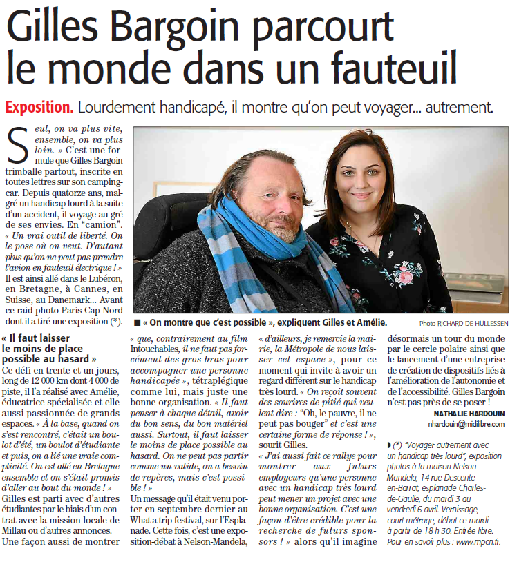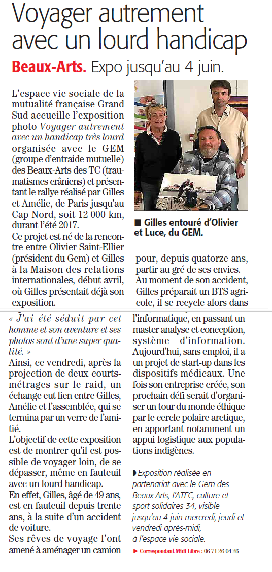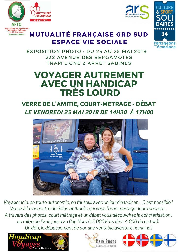 Le vendredi 25 Mai 2018 nous sommes invités par le GEM à partager notre expérience du voyage & du handicap sous forme d’une conférence vidéo salle de Languedoc Mutualité aux Sabines de 14 à 17 heures, suivie par la guitare et la voix de NIKI STONE